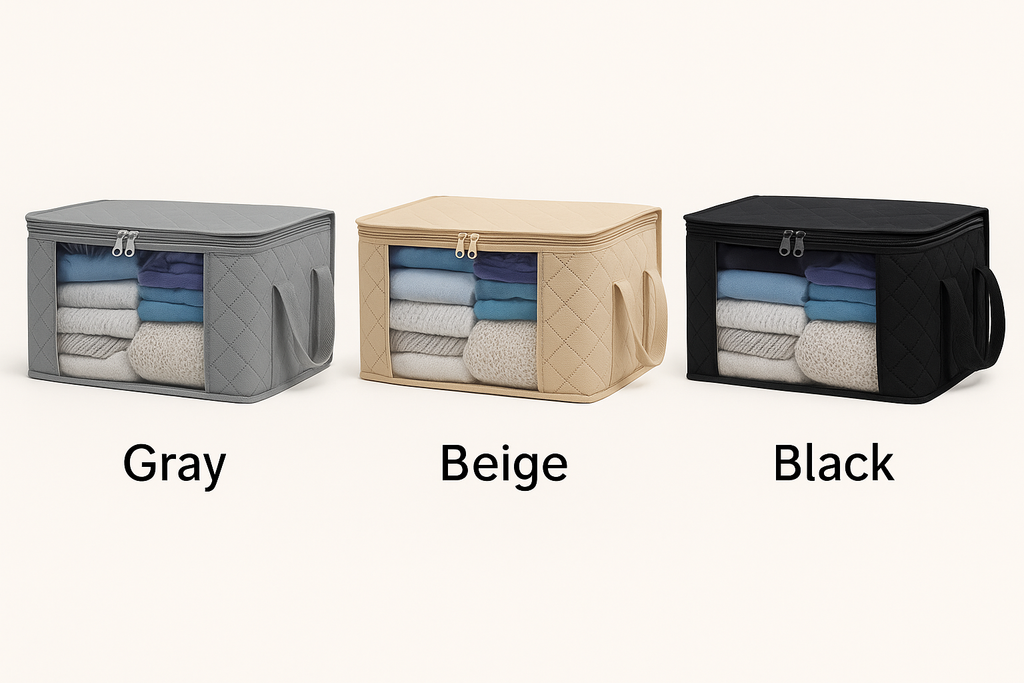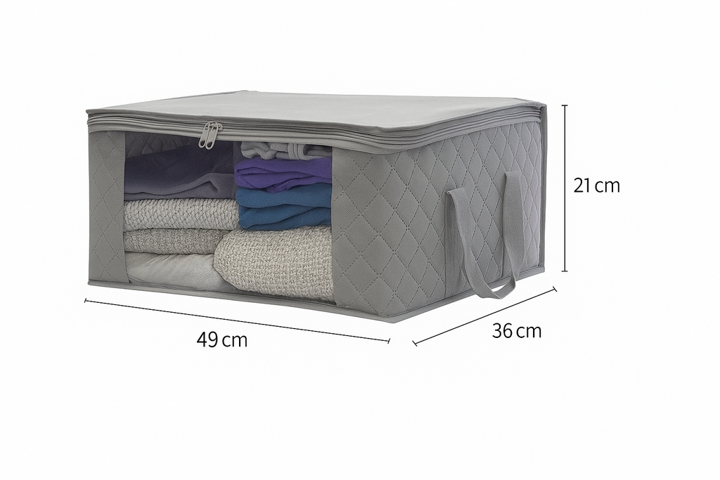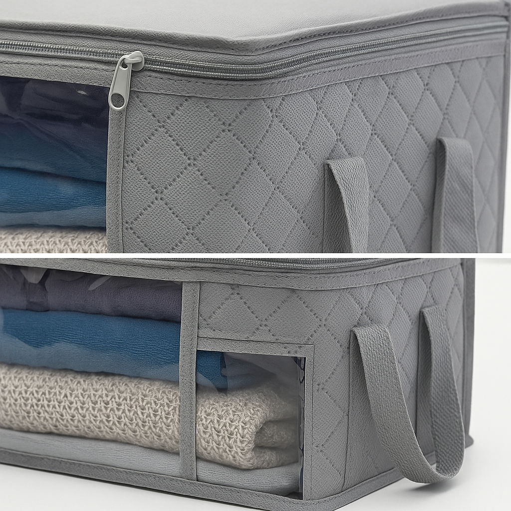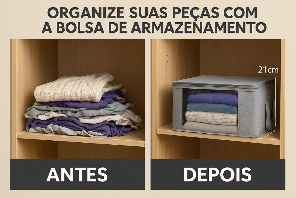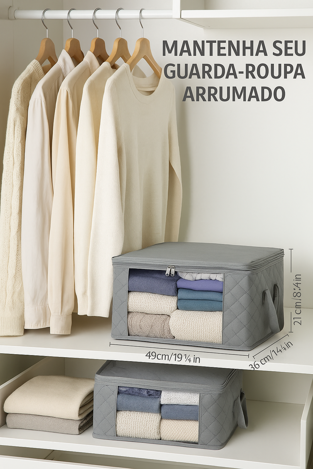 O Organizador Dobrável com Zíper e Visor Transparente mantém suas roupas e acessórios sempre bem armazenados, protegidos e fáceis de encontrar, trazendo ordem e elegância para qualquer ambiente.